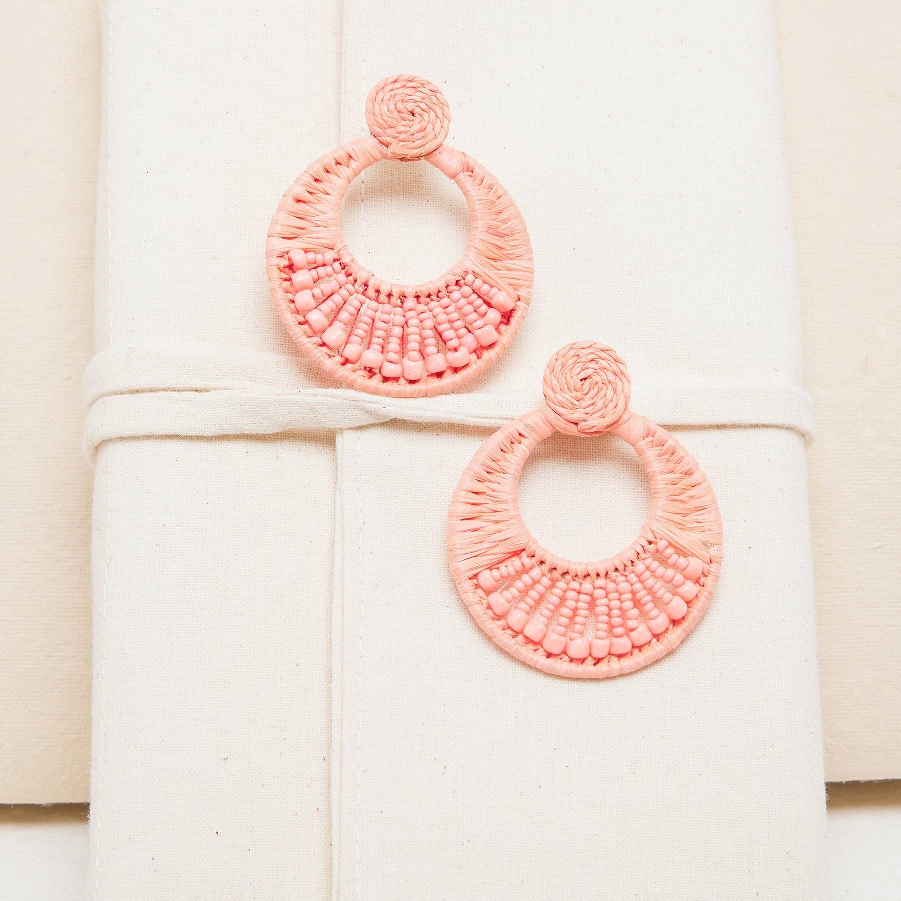 Boucles d'oreilles rondes en raphia et perle de verre.