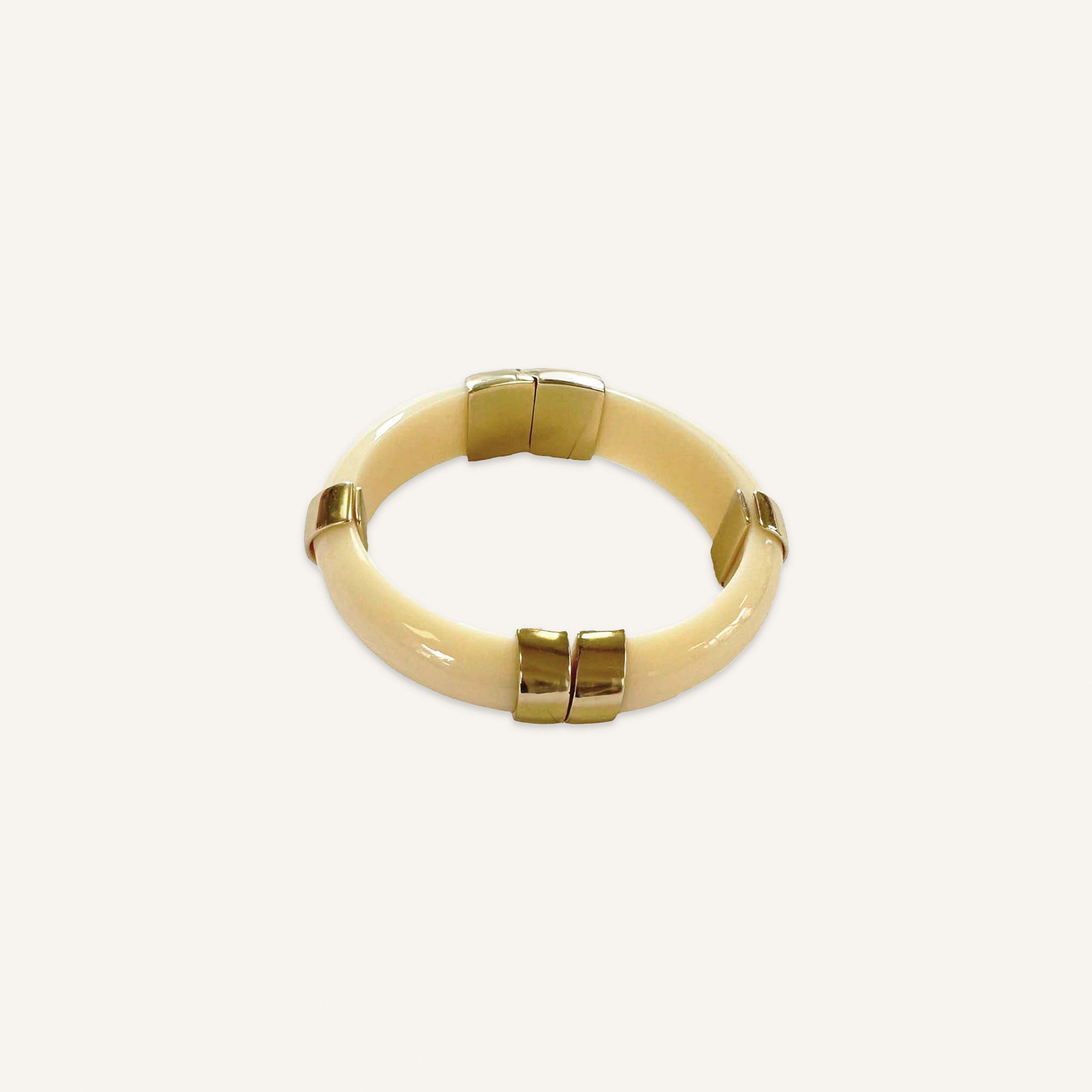 Jonc large et bombé ouvrant en acétate de couleur unie et détails dorés.
