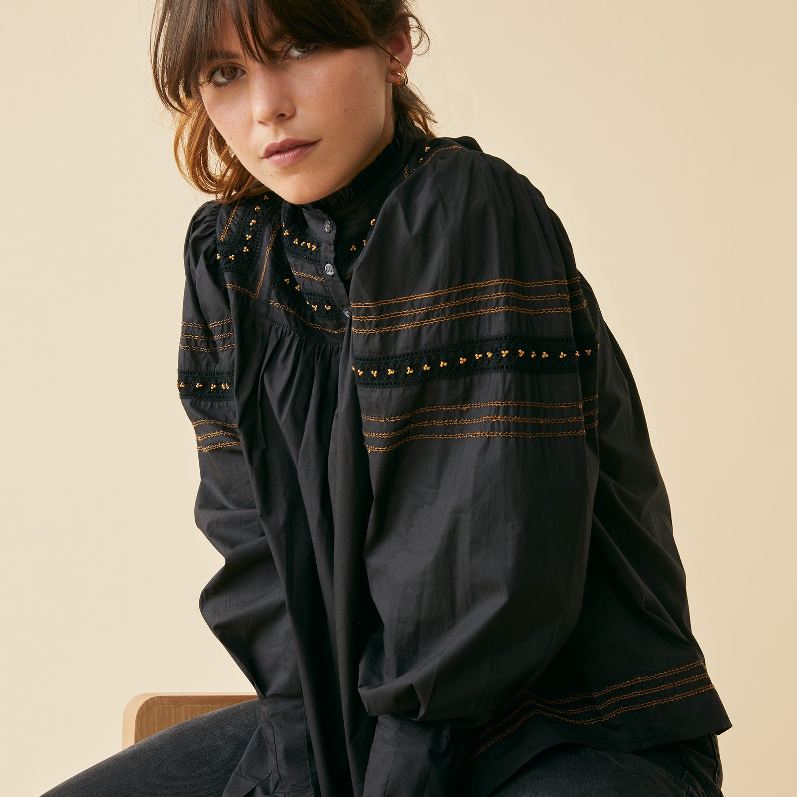 Col montant et volanté, fermeture 3 boutons devant.