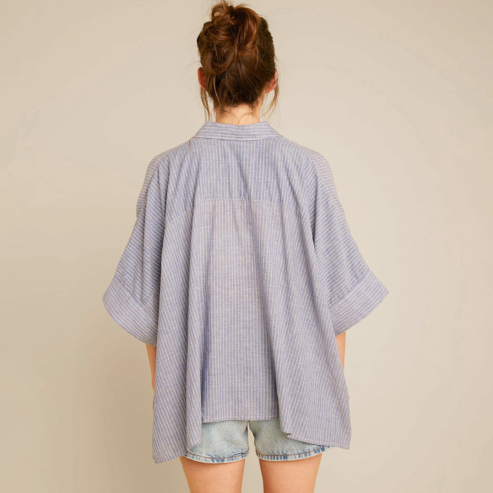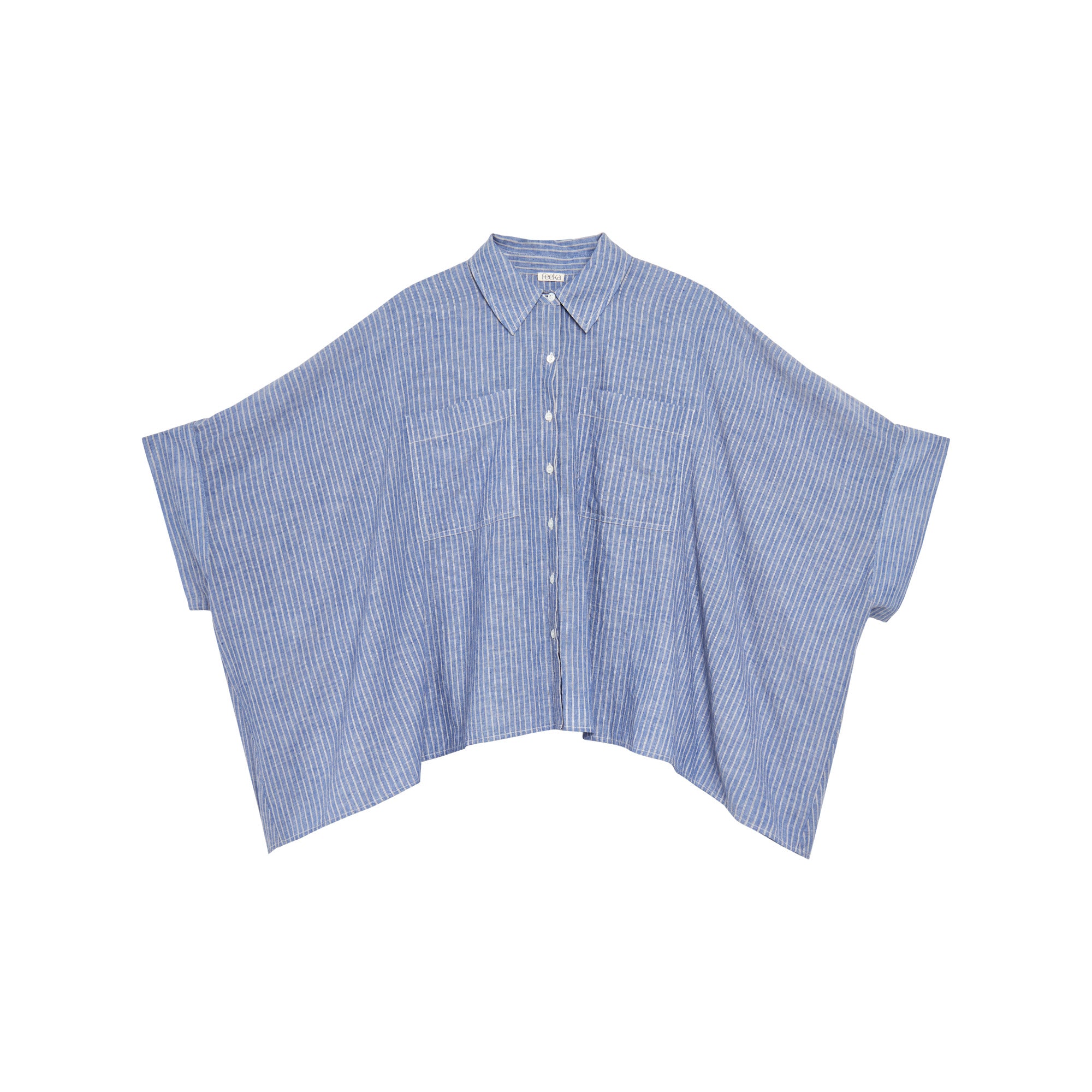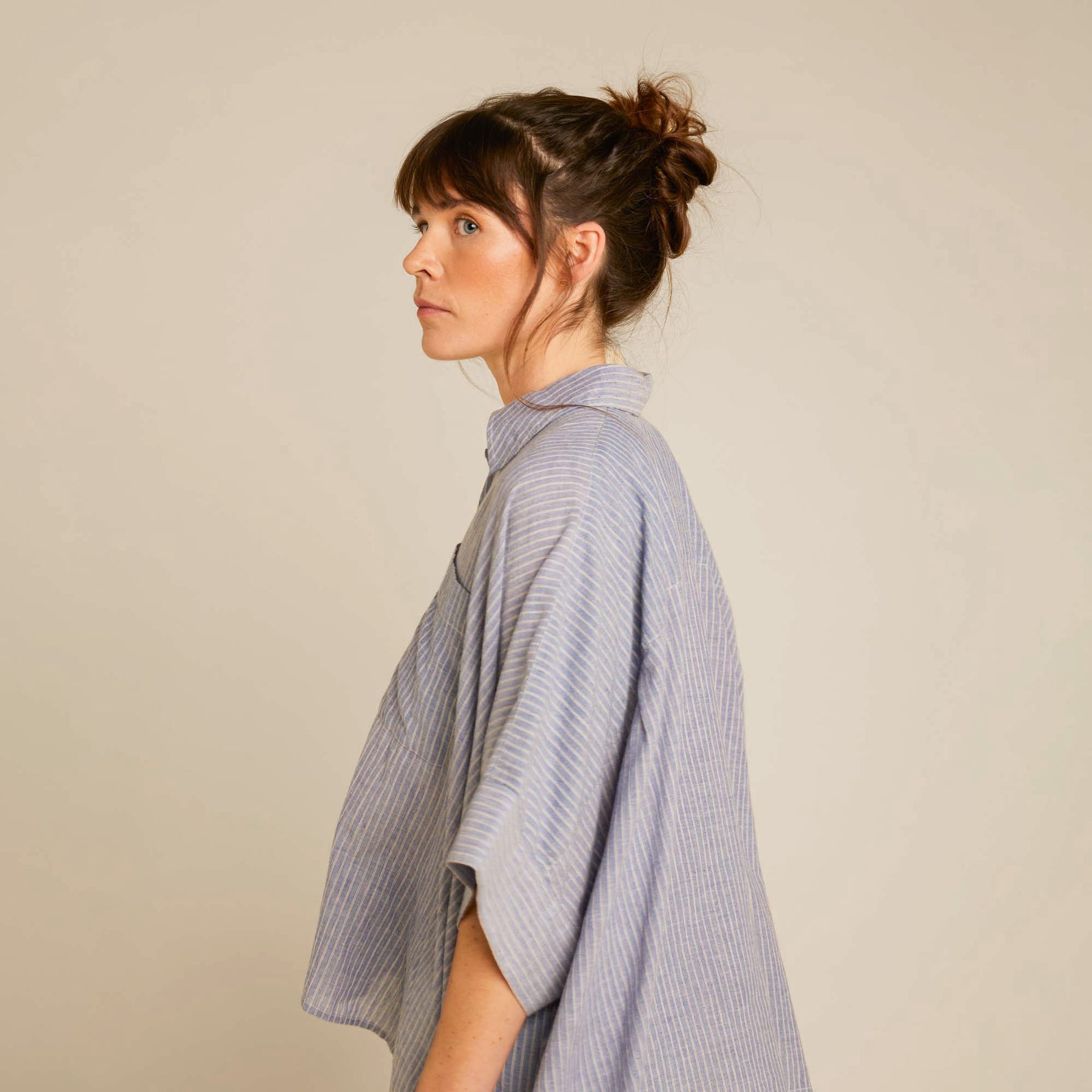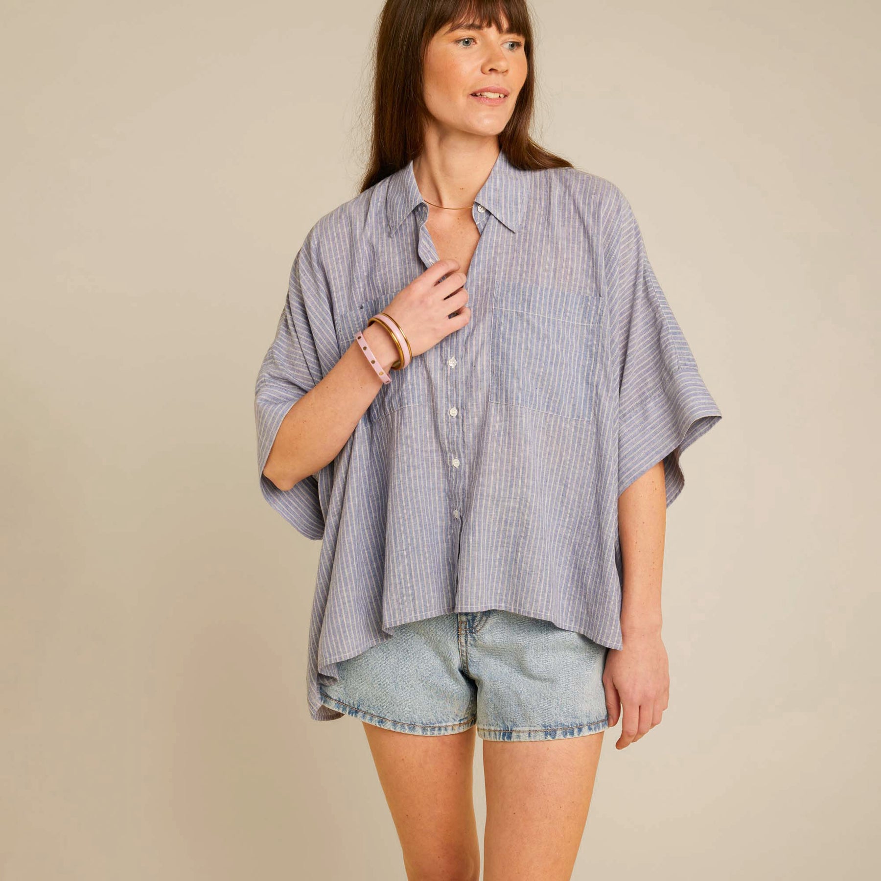 Notre chemisier a rayures Boxy avec manches esprit kimono en coton tissé à la main Chemise en coton léger Volume oversize Large revers à la manche Poches plaquées à l’avant Col chemise Patte de boutonnage 7 boutons nacre Motif rayé contrasté Longueur : 61cm pour une taille S Lina mesure 1m77 et porte une taille S