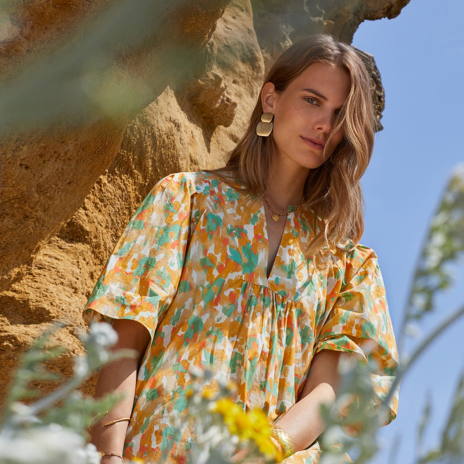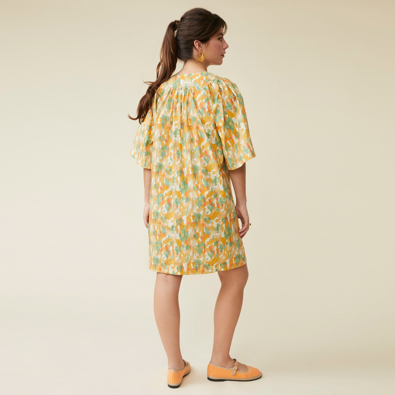 Robe courte en popeline de coton imprimé esprit tye and dye multicolore.