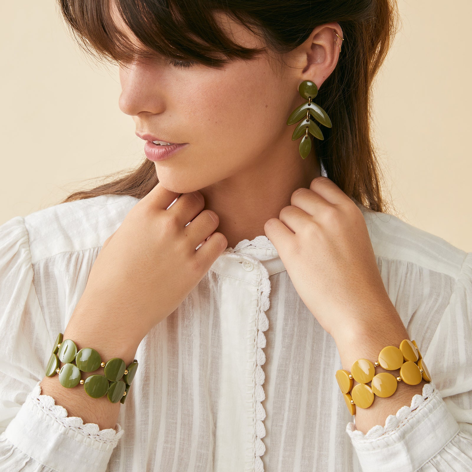 Bracelet manchette élastiqué avec facettes rondes plate en acétate et perles dorées alternées, finition brillante.