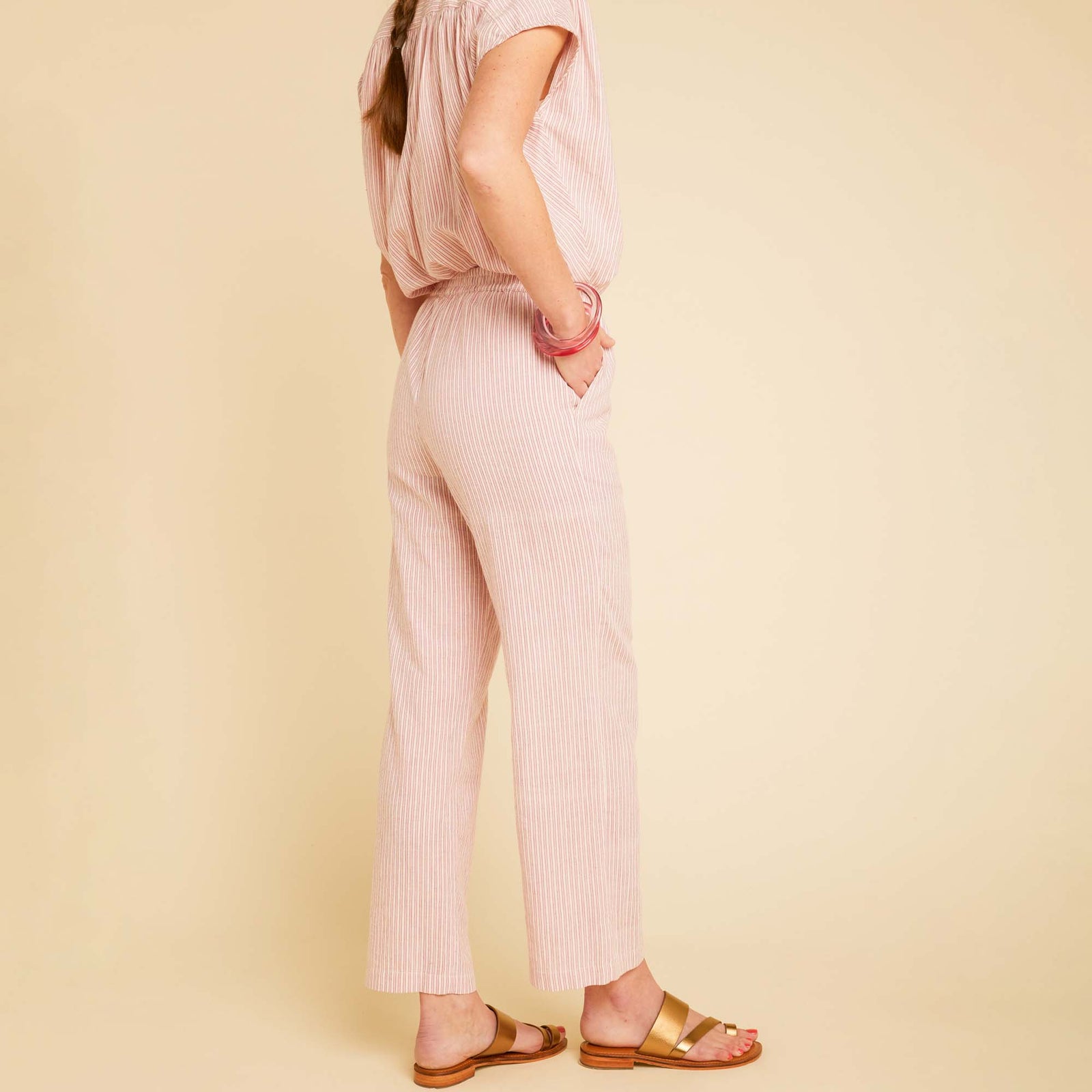 Notre pantalon d’ensemble à rayures Juhi. Pantalon en coton léger tissé à la main. Taille élastiquée. Poches de chaque coté. Motif rayé. Se porte en set avec nos blouses et chemises.