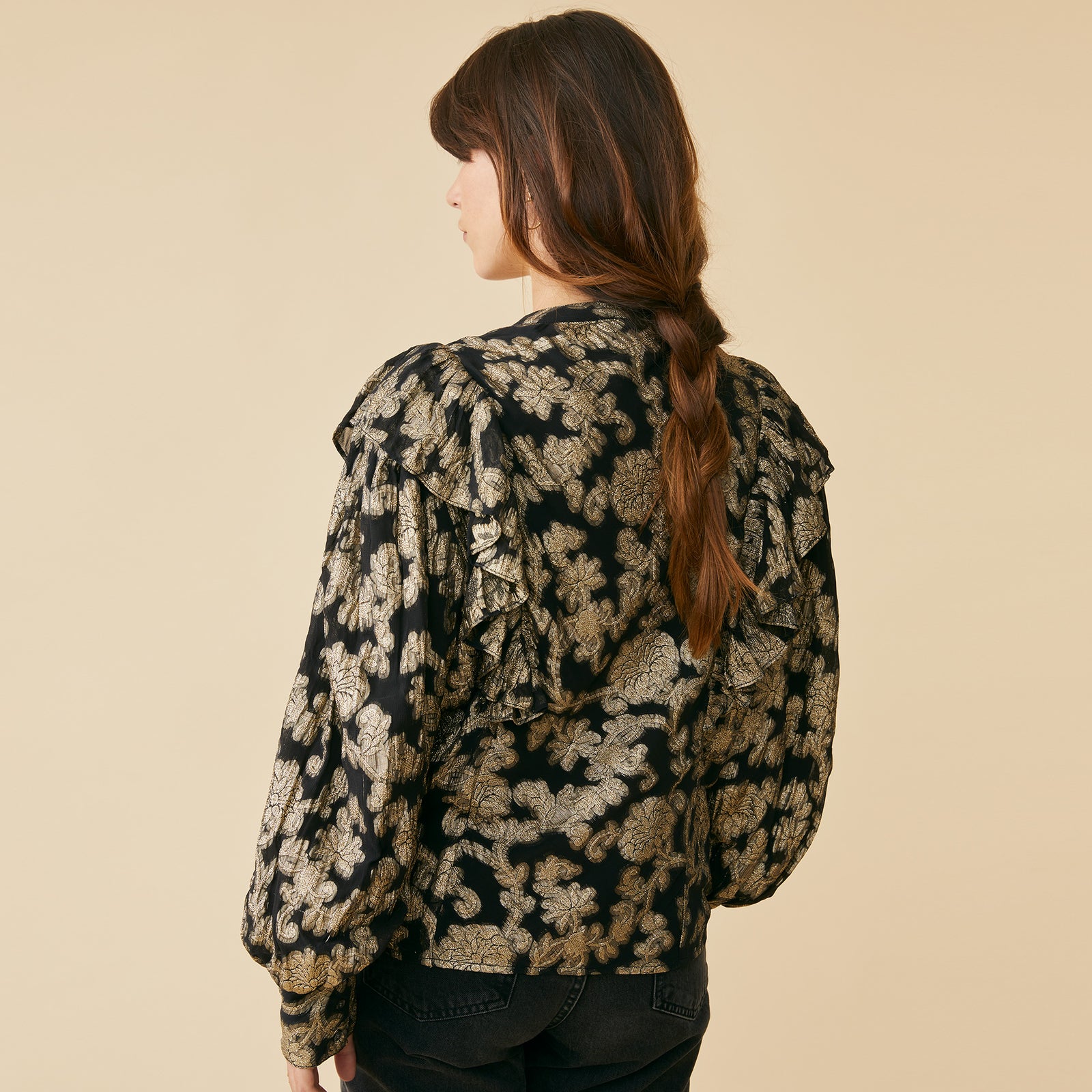 Blouse manches longues avec volants en jacquard de viscose doré.