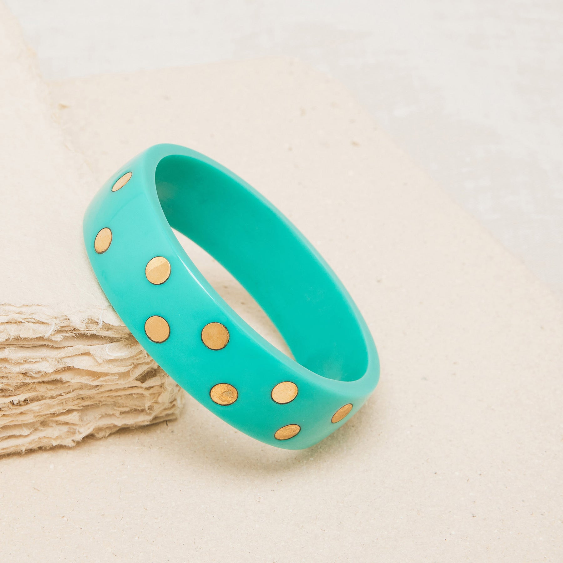 Jonc large arrondi en acétate de couleur unie et pois en métal doré.