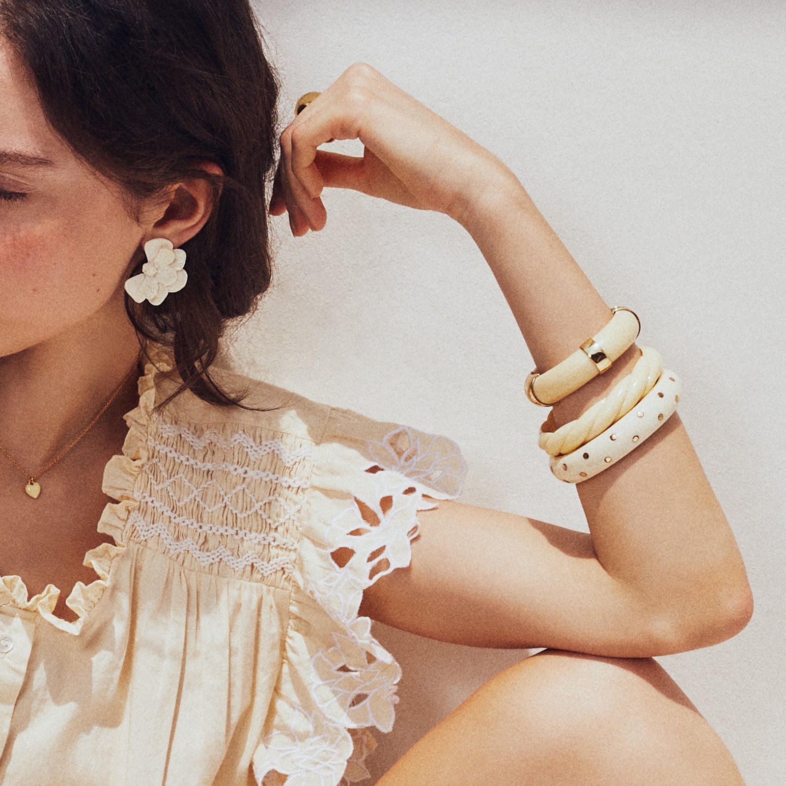 Découvrez les coloris exclusifs de nos joncs, nos boucles d’oreilles, et nos bagues en acétate.