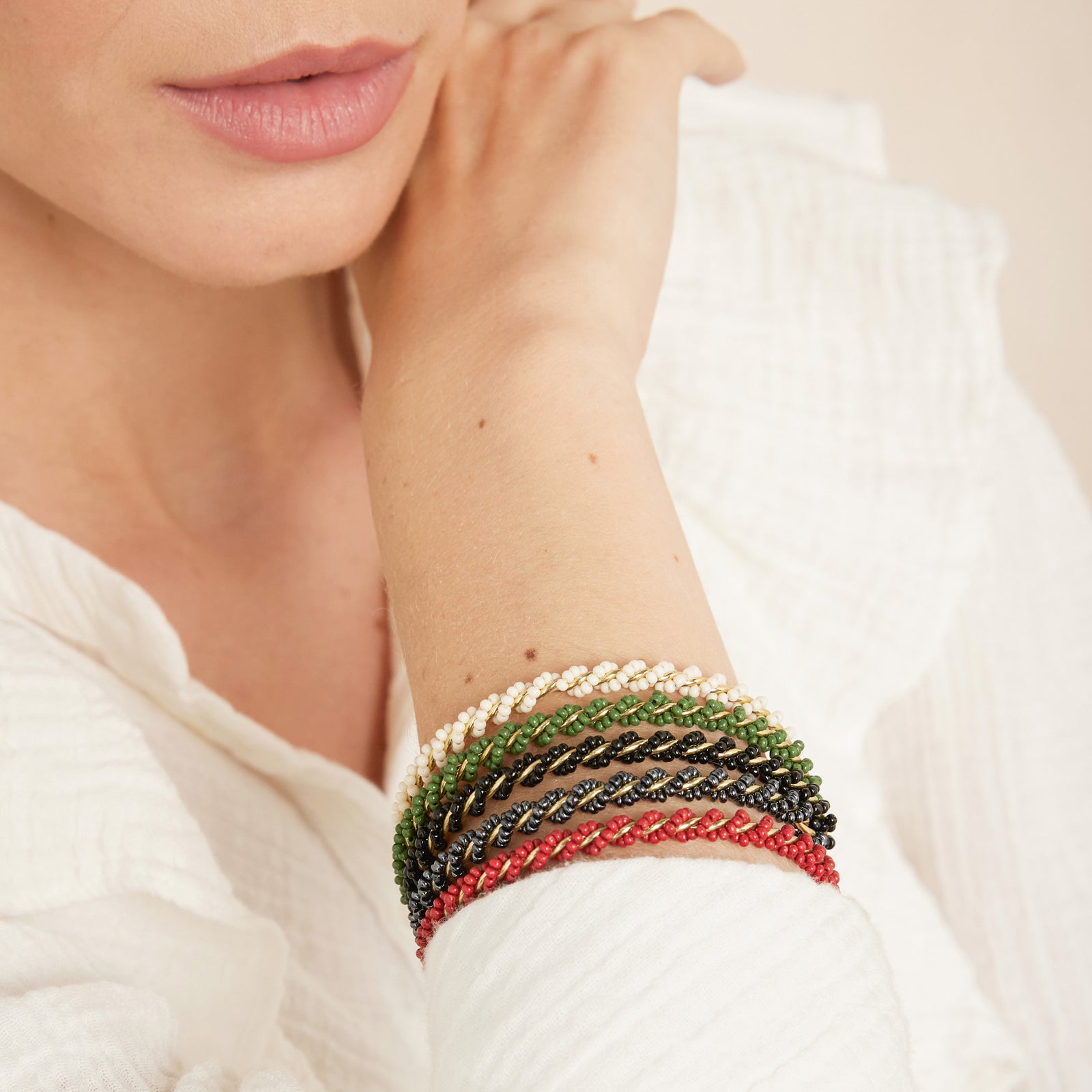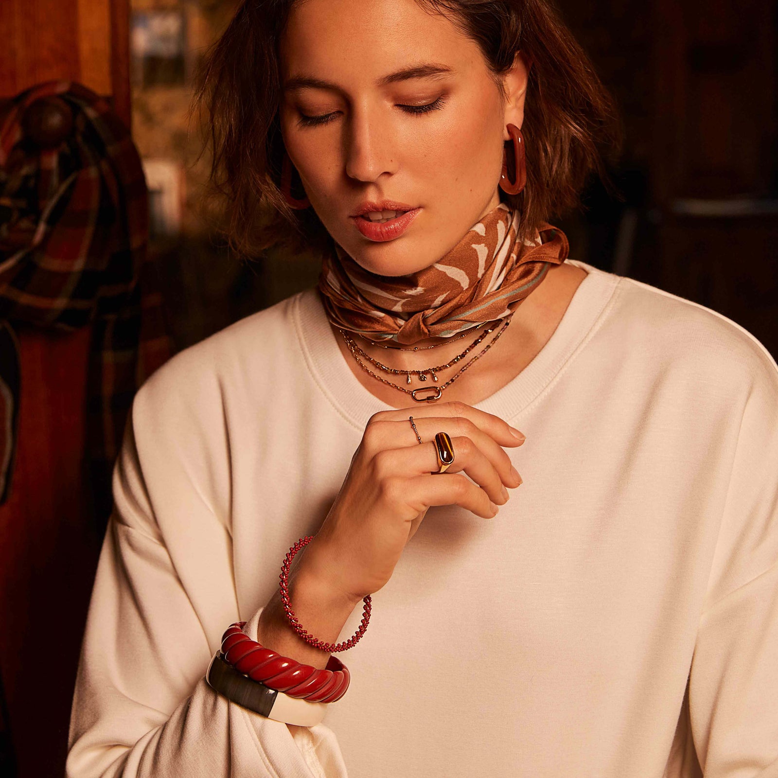 Découvrez les coloris exclusifs de nos joncs, nos boucles d’oreilles, et nos bagues en acétate.