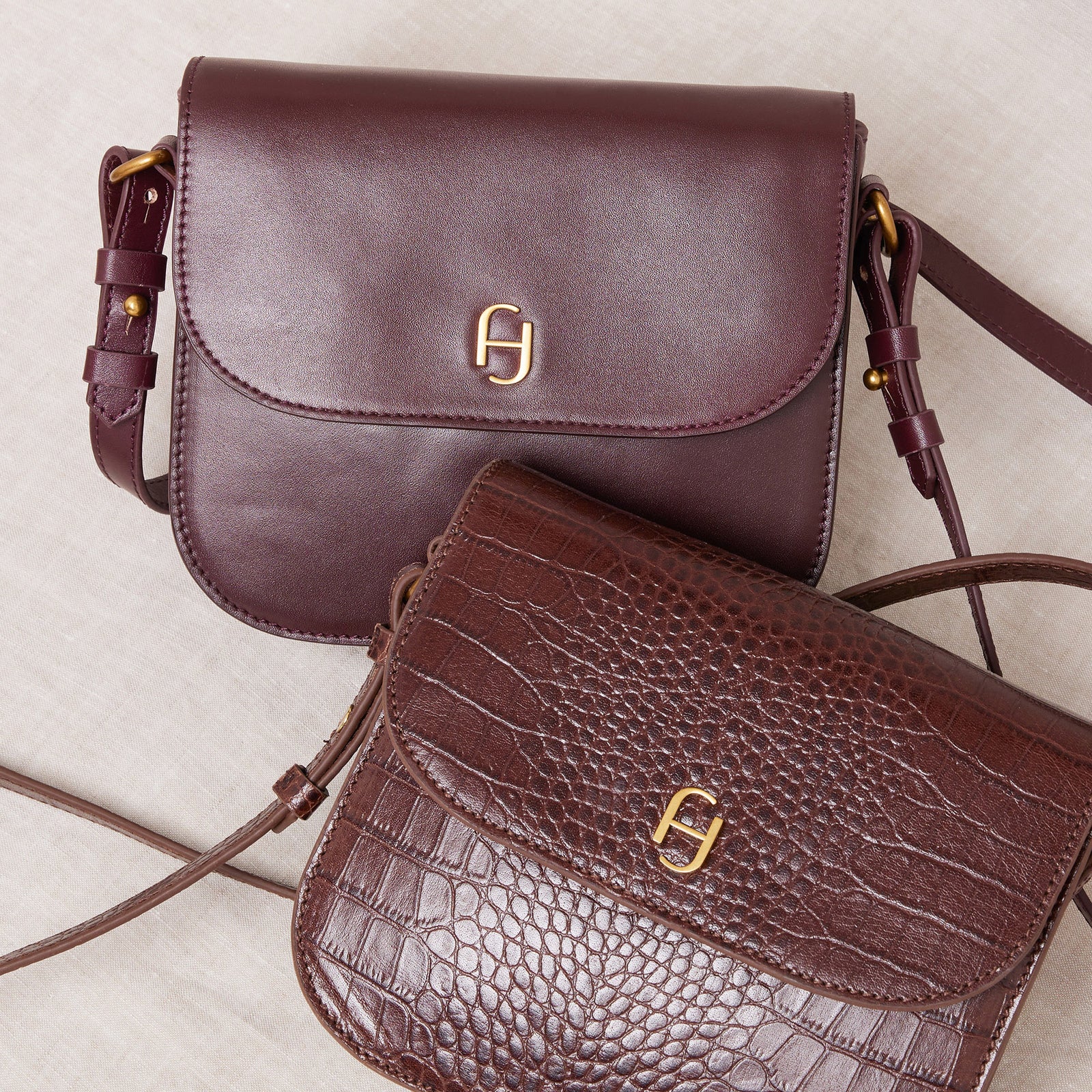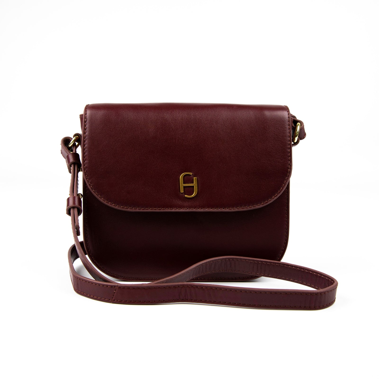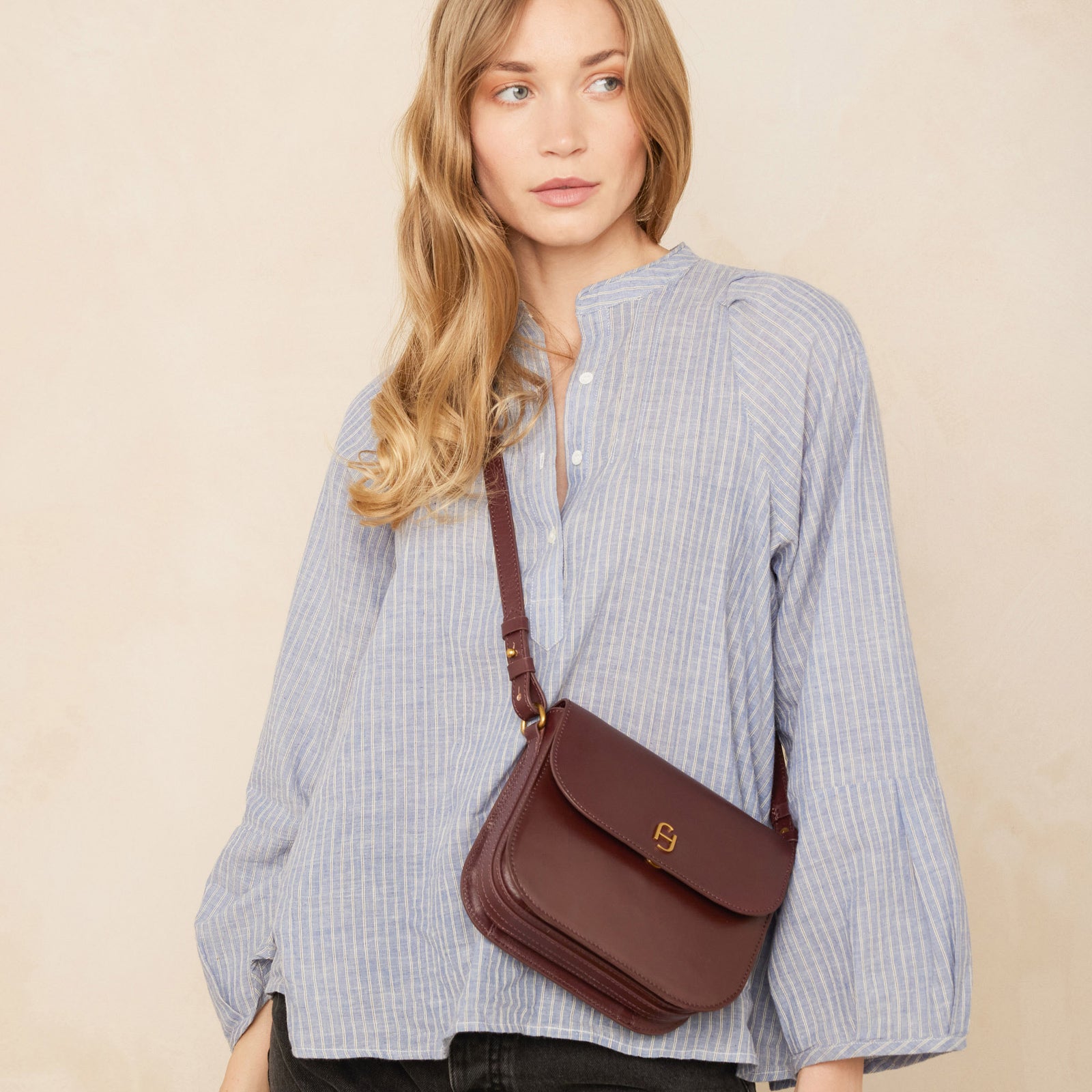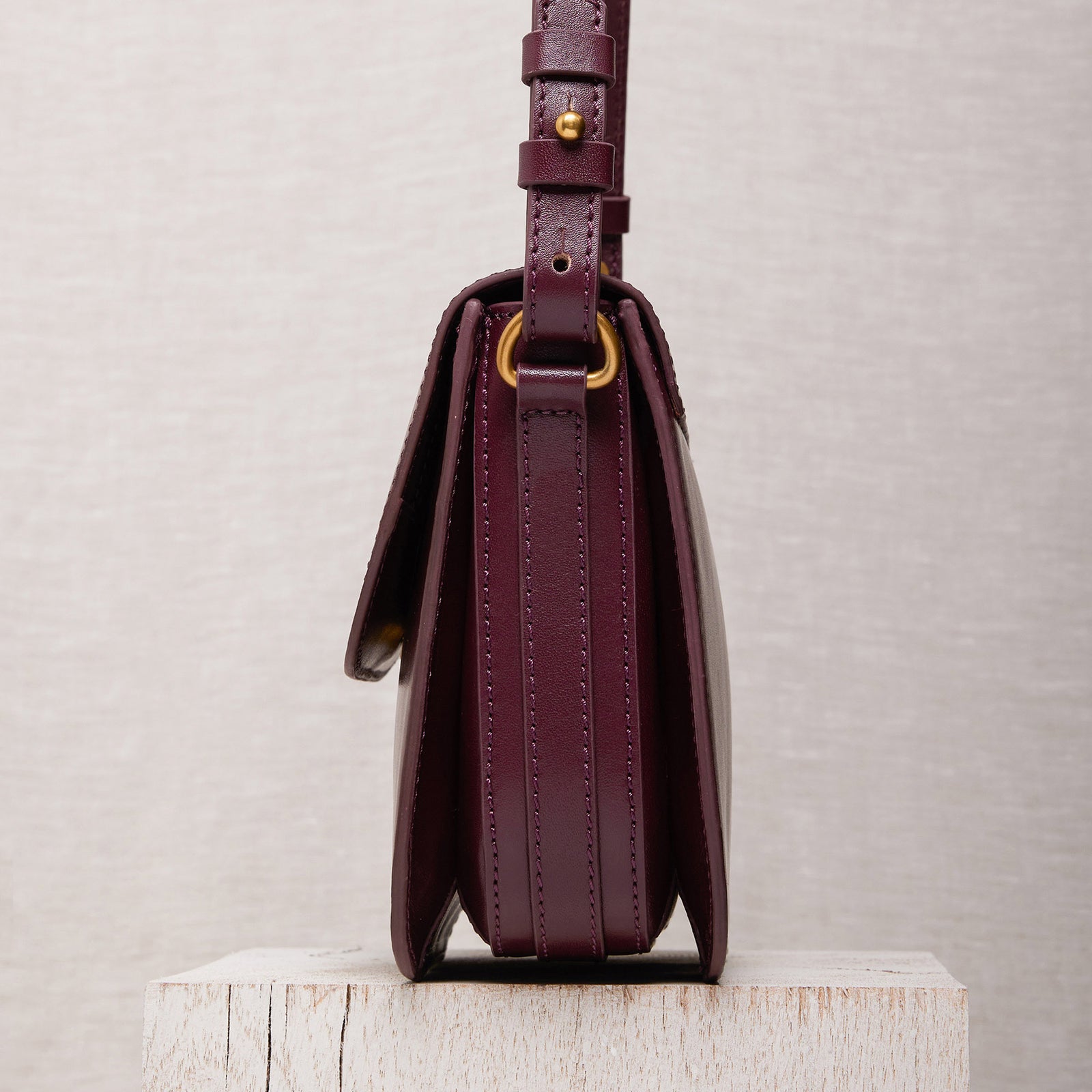 Mini sac rectangulaire à rabat en cuir lisse avec bandoulière ajustable, porté épaule ou croisé.