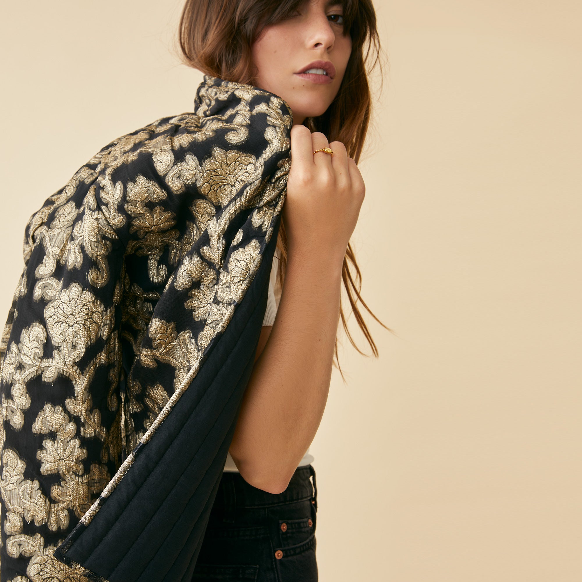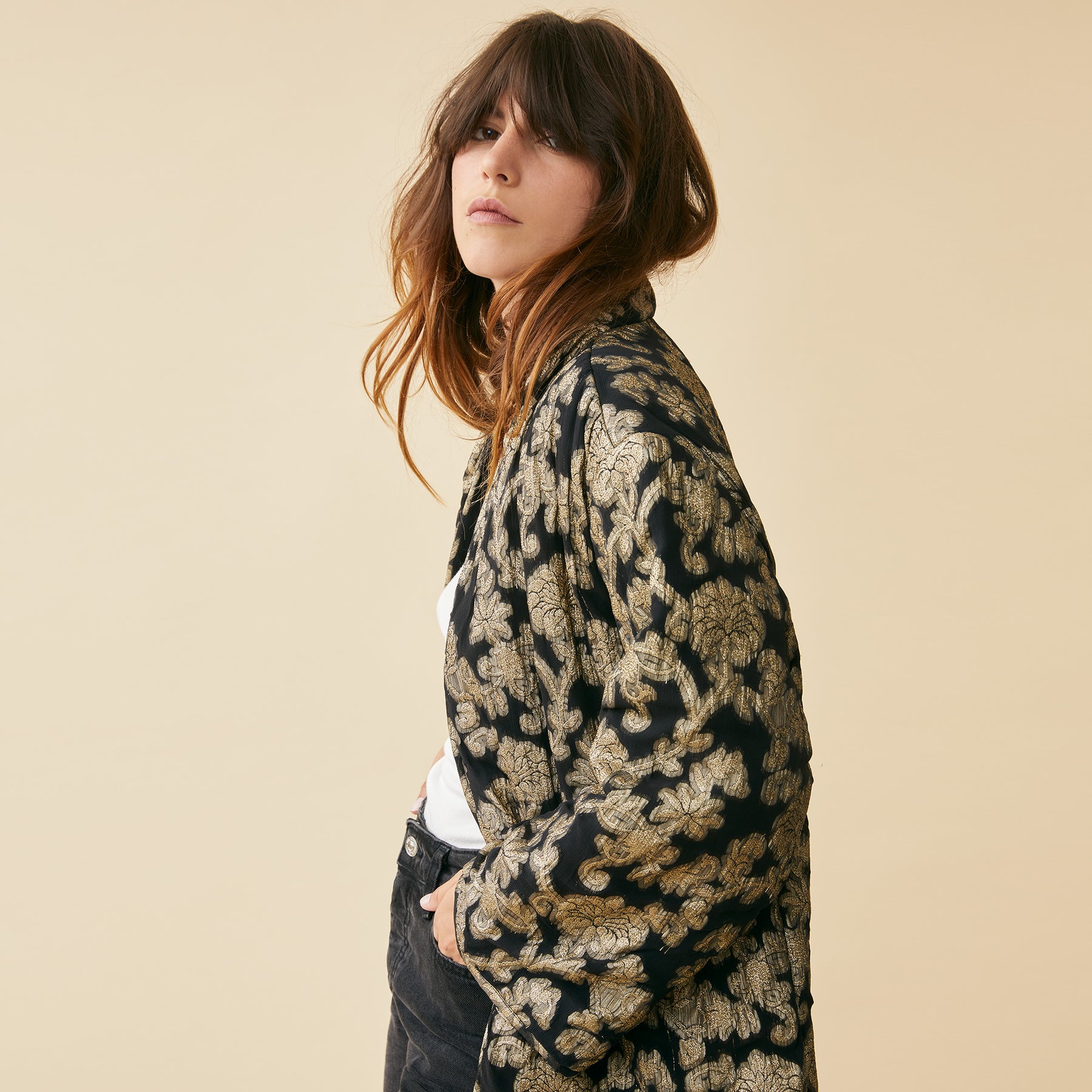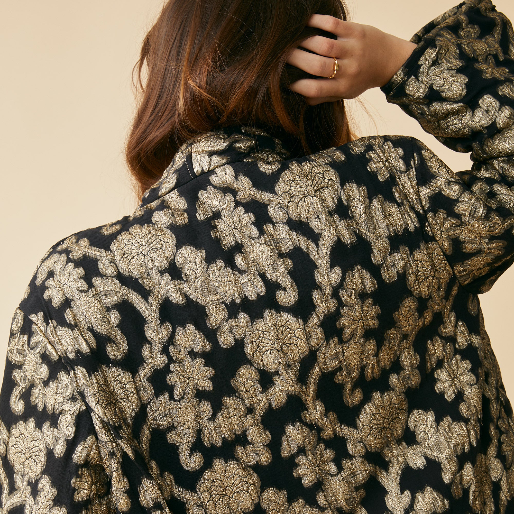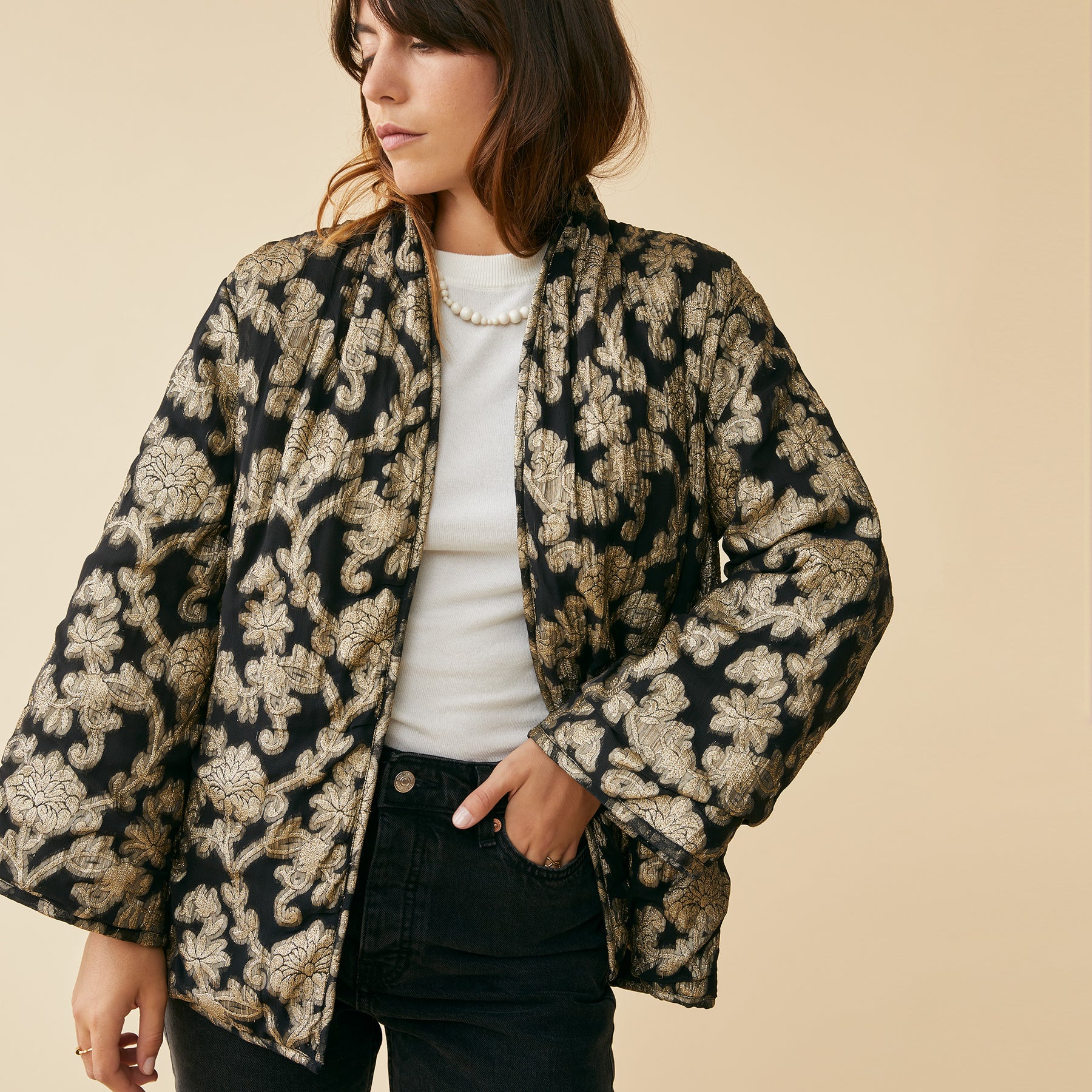 Veste esprit kimono manches longues en jacquard de viscose doré.