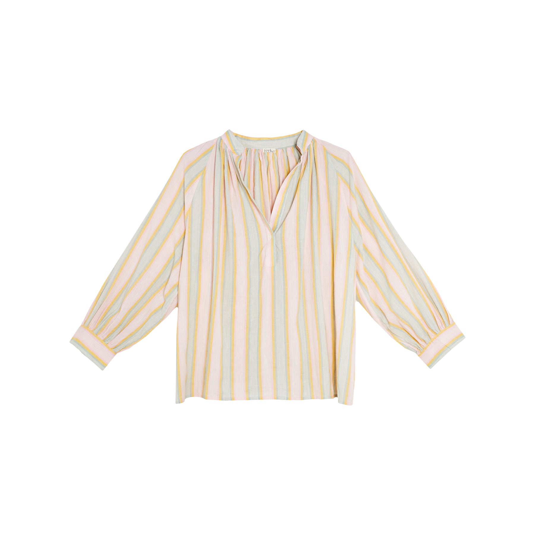 Notre blouse rayée Namita, en coton tissé à la main Blouse en coton avec dos froncé Manches raglan 3/4 Poches invisibles de chaque coté Col V avec fronces Patte de boutonnage un bouton nacre Motif rayures Feeka Longueur : 62 cm pour une taille S Lina mesure 1m77 et porte une taille S