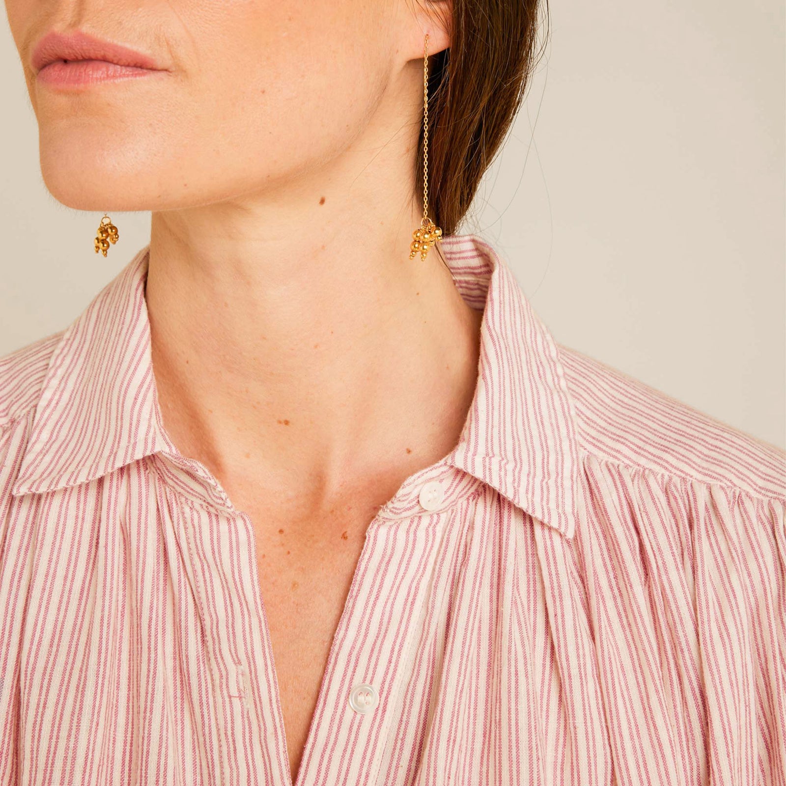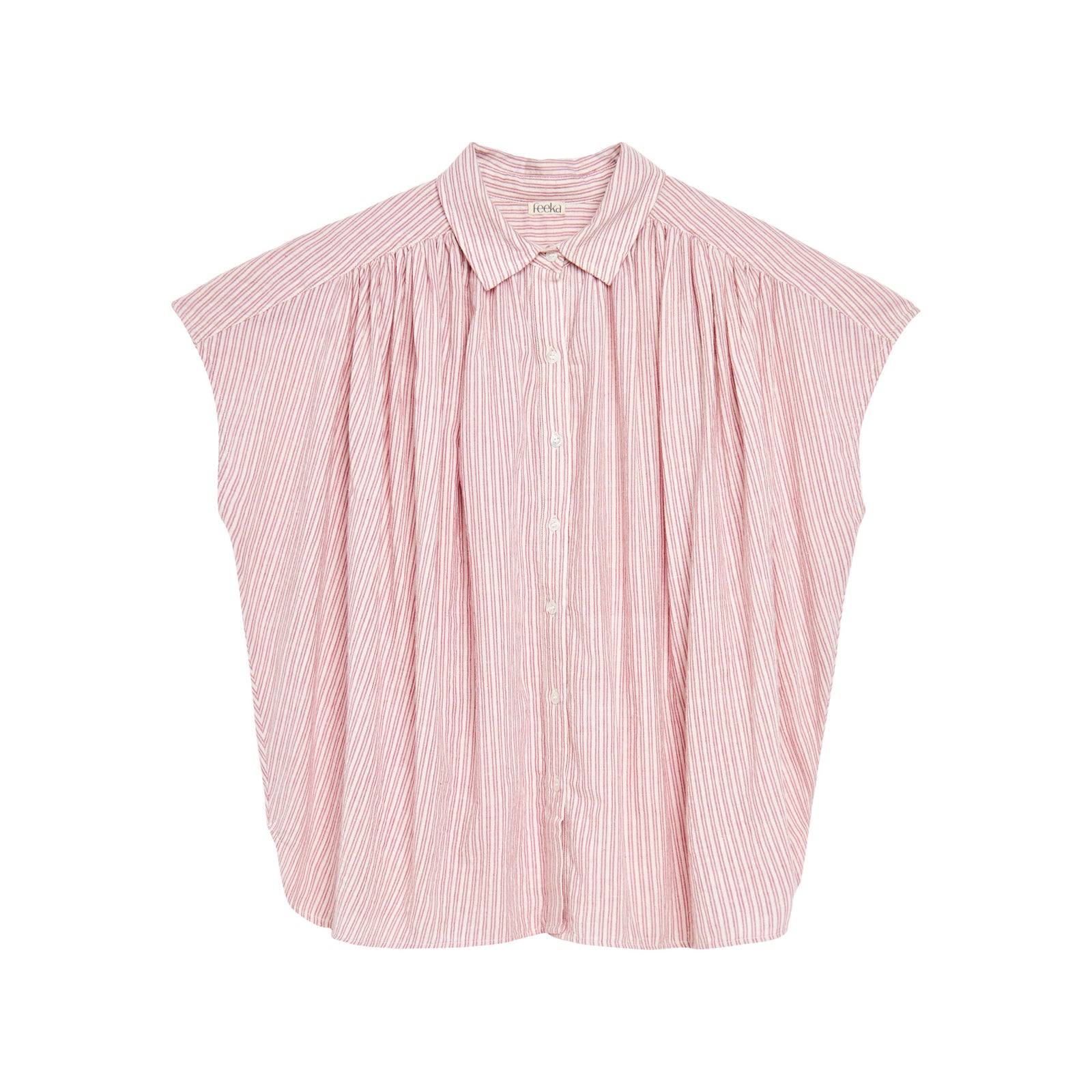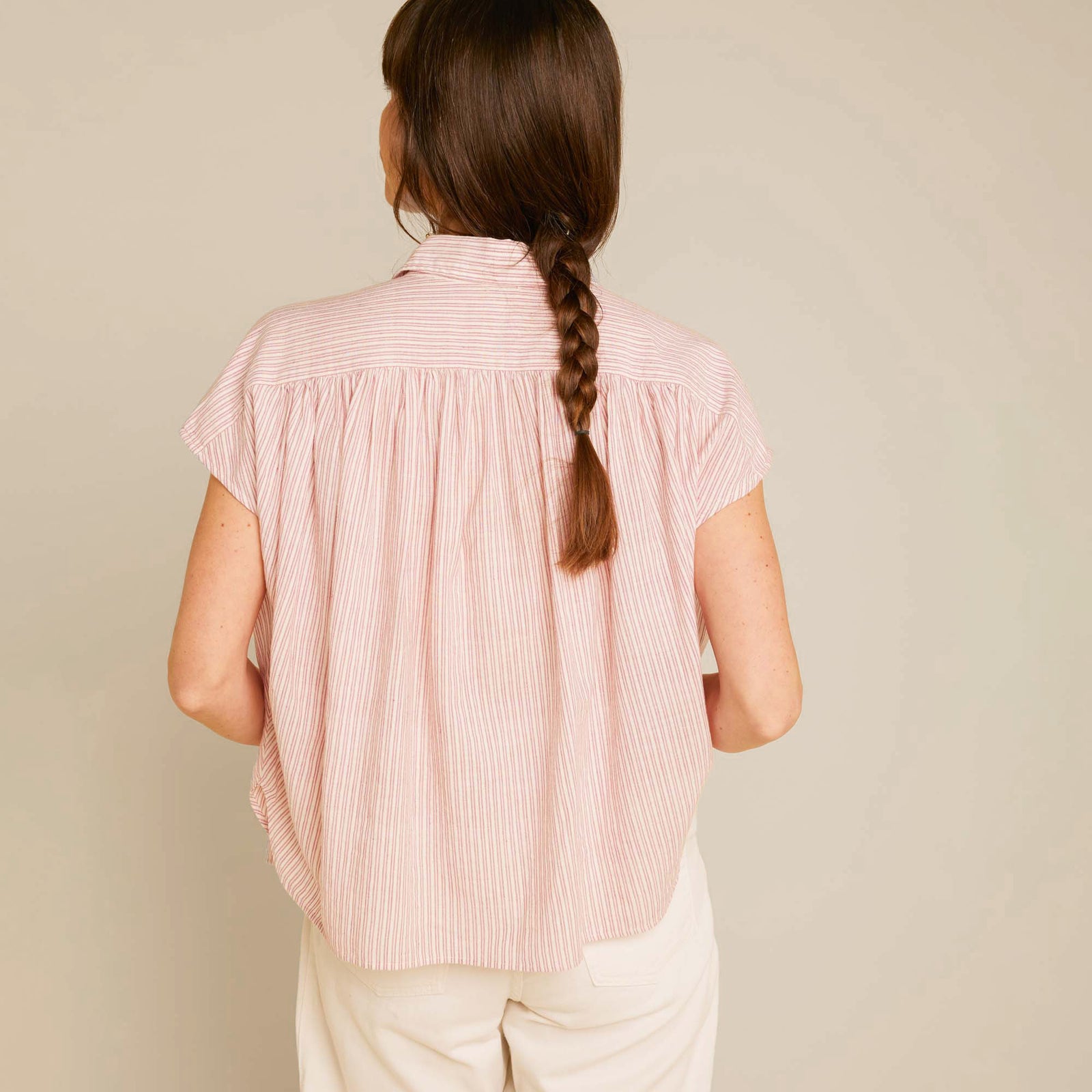 Notre chemise d’ensemble à rayures, Nila, sans manches à la coupe large Chemisier en coton qui couvre les épaules Col chemise Patte de boutonnage 7 boutons nacre Fronces au niveau des épaules Motif rayures contrastées Se porte en set avec le Short Jyoti ou le pantalon Juhi Longueur : 60 cm pour une taille S Lina mesure 1m77 et porte une taille S
