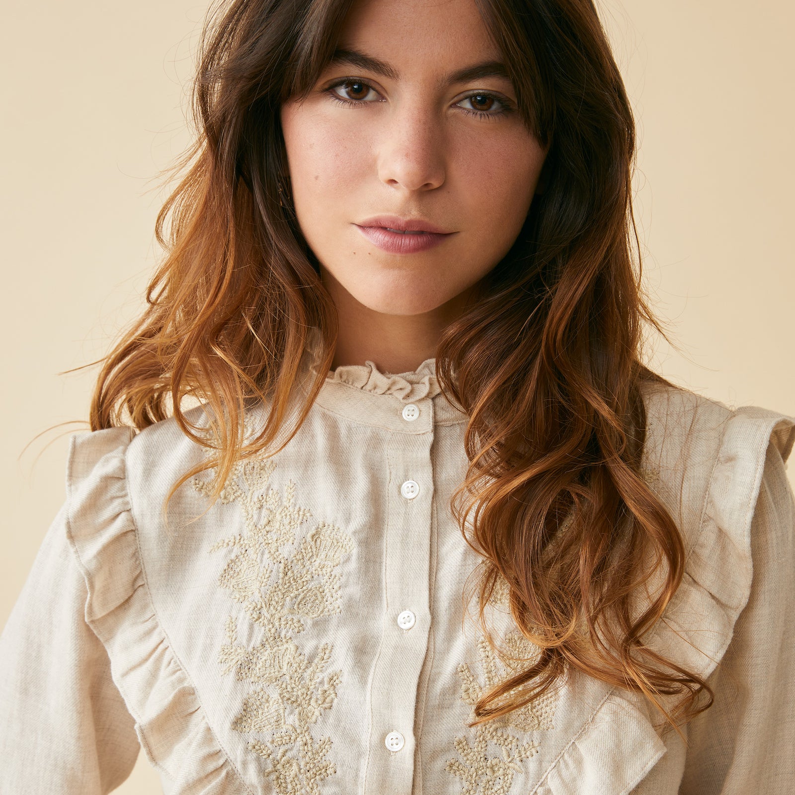Blouse manches longues avec empiècement brodé et volanté effet western.