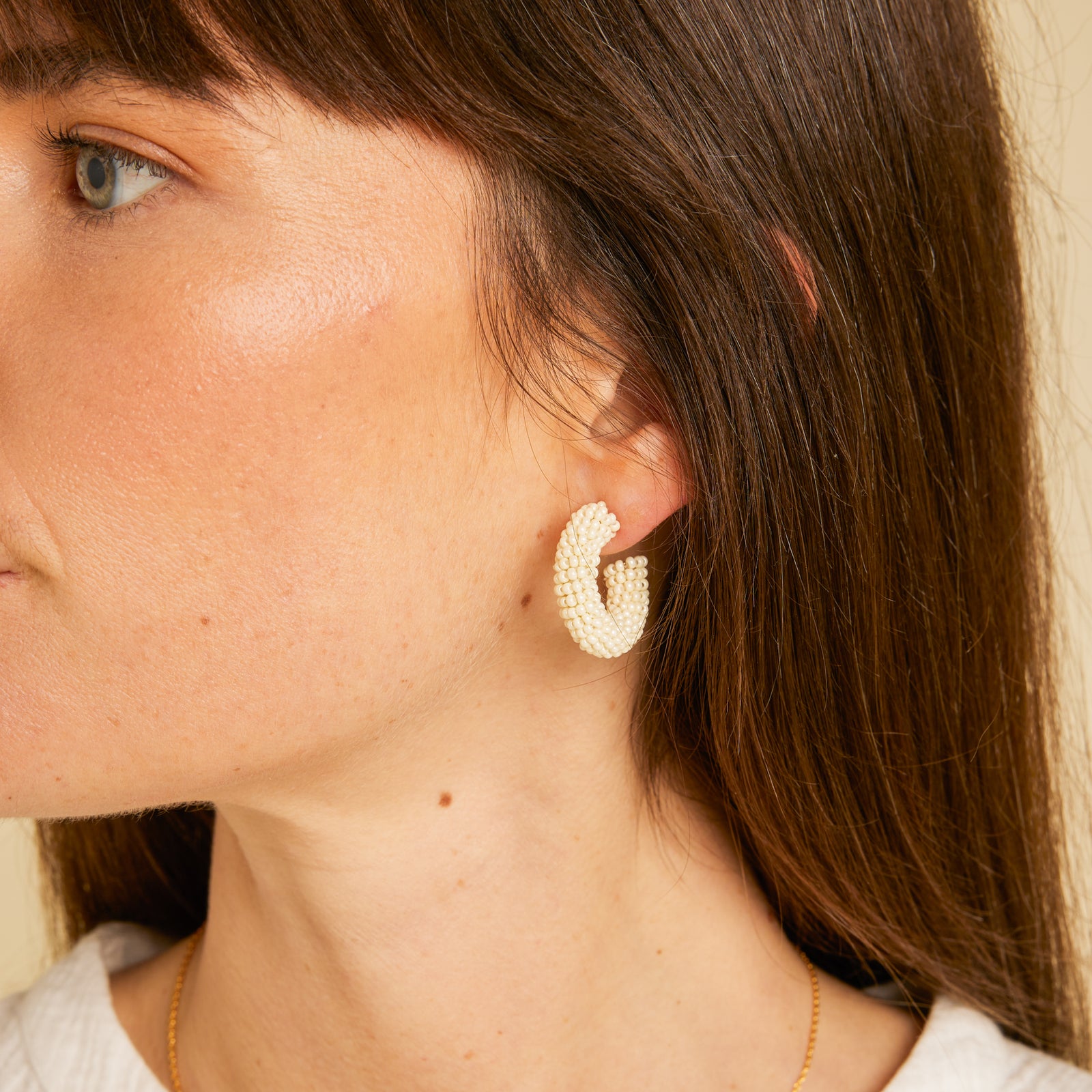 Mini créoles ouvertes entourées de perles colorées tissées à la main.
