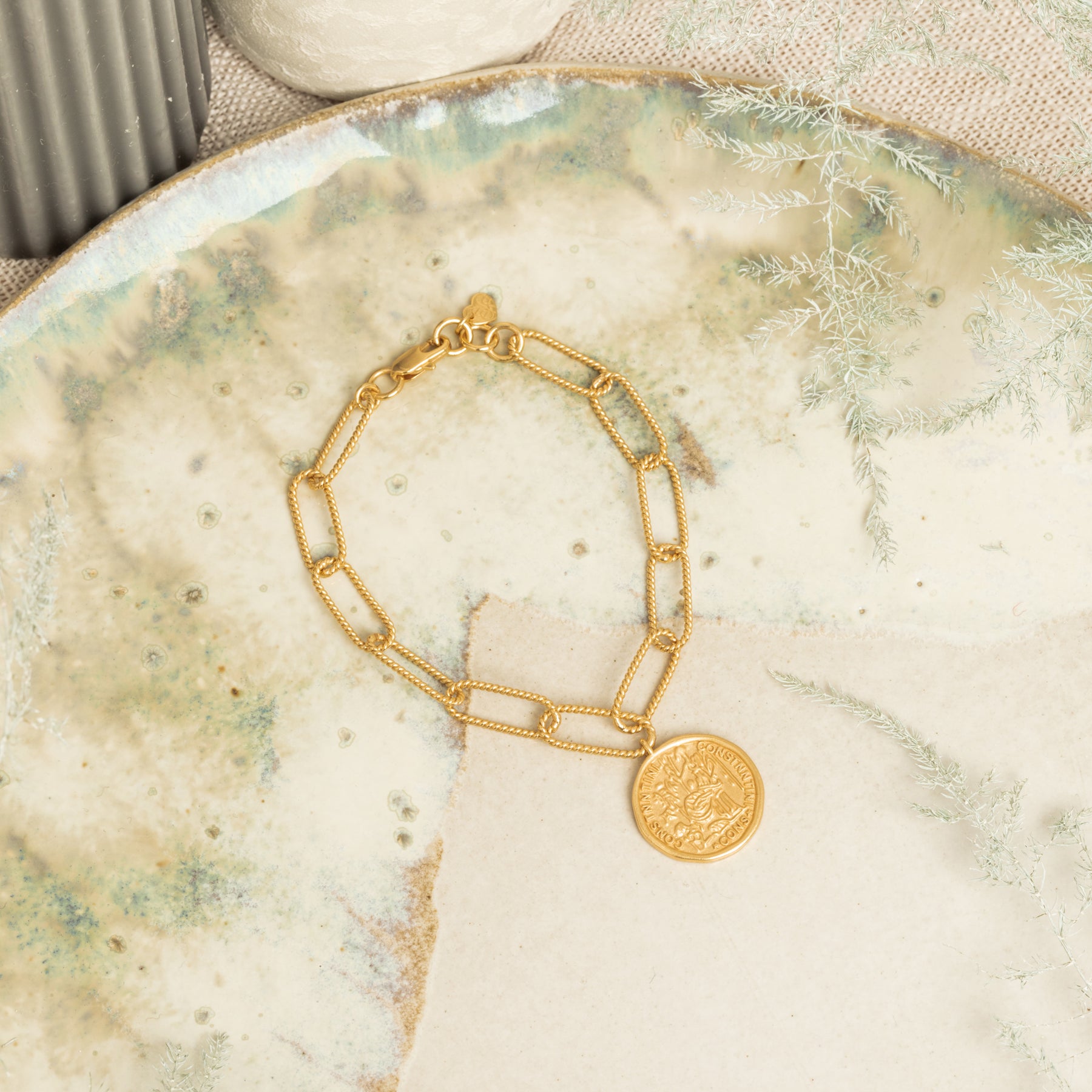 Bracelet chaîne maillons rectangulaires texturés avec pendentif pièce esprit médaille antique, fermoir rectangulaire.